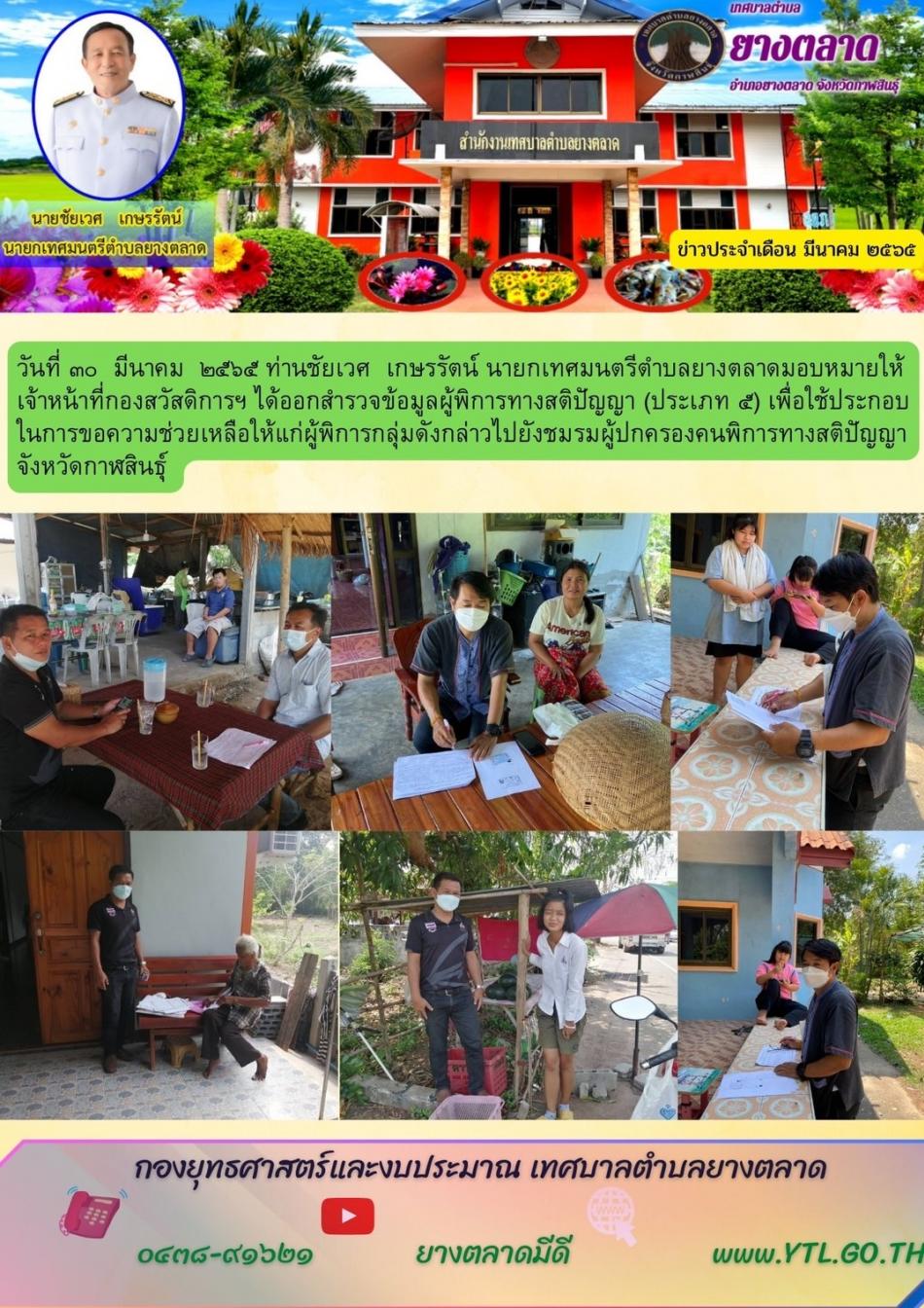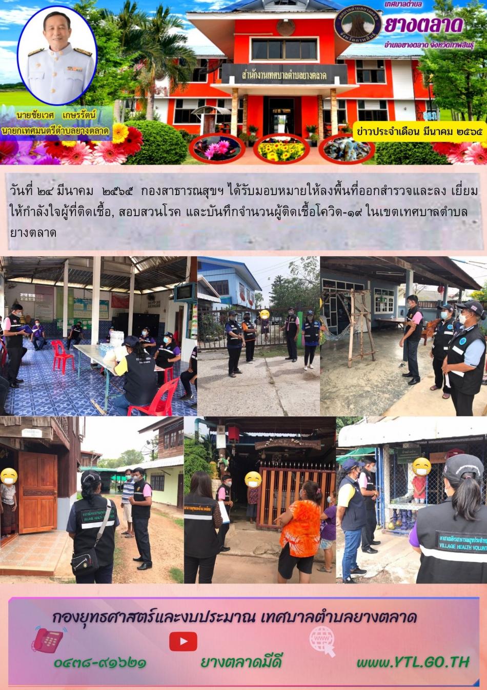วันที่ ๒๔ มีนาคม ๒๕๖๕ กองสาธารณสุขฯ ได้รับมอบหมายให้ลงพื้นที่ออกสำรวจและลง เยี่ยมให้กำลังใจผู้ที่ติดเชื้อ, สอบสวนโรค และบันทึกจำนวนผู้ติดเชื้อโควิด-๑๙ ในเขตเทศบาลตำบลยางตลาด [25 มีนาคม 2565]