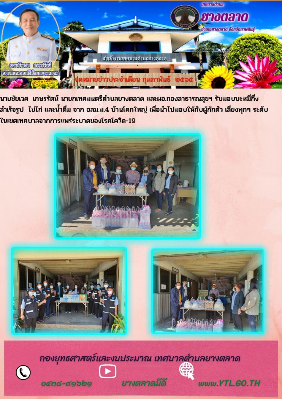 นายกเทศมนตรีตำบลยางตลาดและผอ.กองสาธารณสุขฯ รับมอบบะหมี่กี่งสำเร็จรูป ไข่ไก่ และน้ำดื่ม จาก อสม.ม.4บ้านโคกใหญ่ เพื่อนำไปมอบให้กับผู้กักตัว เสี่ยงทกๆระดับในเขตเทศบาลตำบลยางตลาด [25 กุมภาพันธ์ 2565]