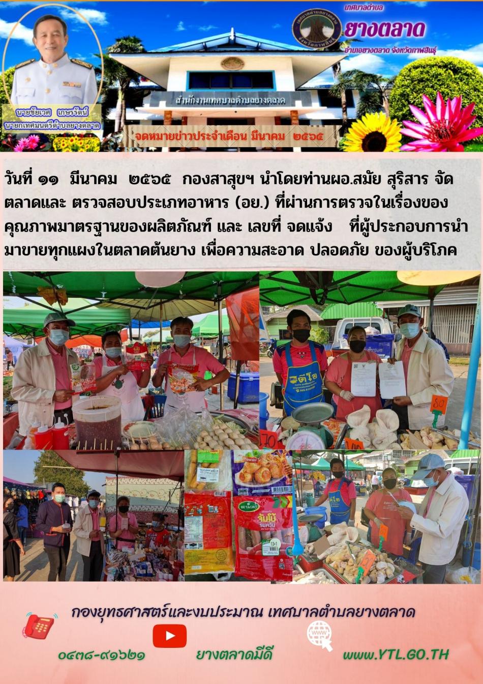 วันที่ ๑๑ มีนาคม ๒๕๖๕ กองสาสุขฯ นำโดยท่านผอ.สมัย สุริสาร จัดตลาดและ ตรวจสอบประเภทอาหาร (อย.) ที่ผ่านการตรวจในเรื่องของคุณภาพมาตรฐานของผลิตภัณฑ์ และ เลขที่ จดแจ้ง ที่ผู้ประกอบการนำมาขายทุกแผงในตลาดต้นยาง... [11 มีนาคม 2565]