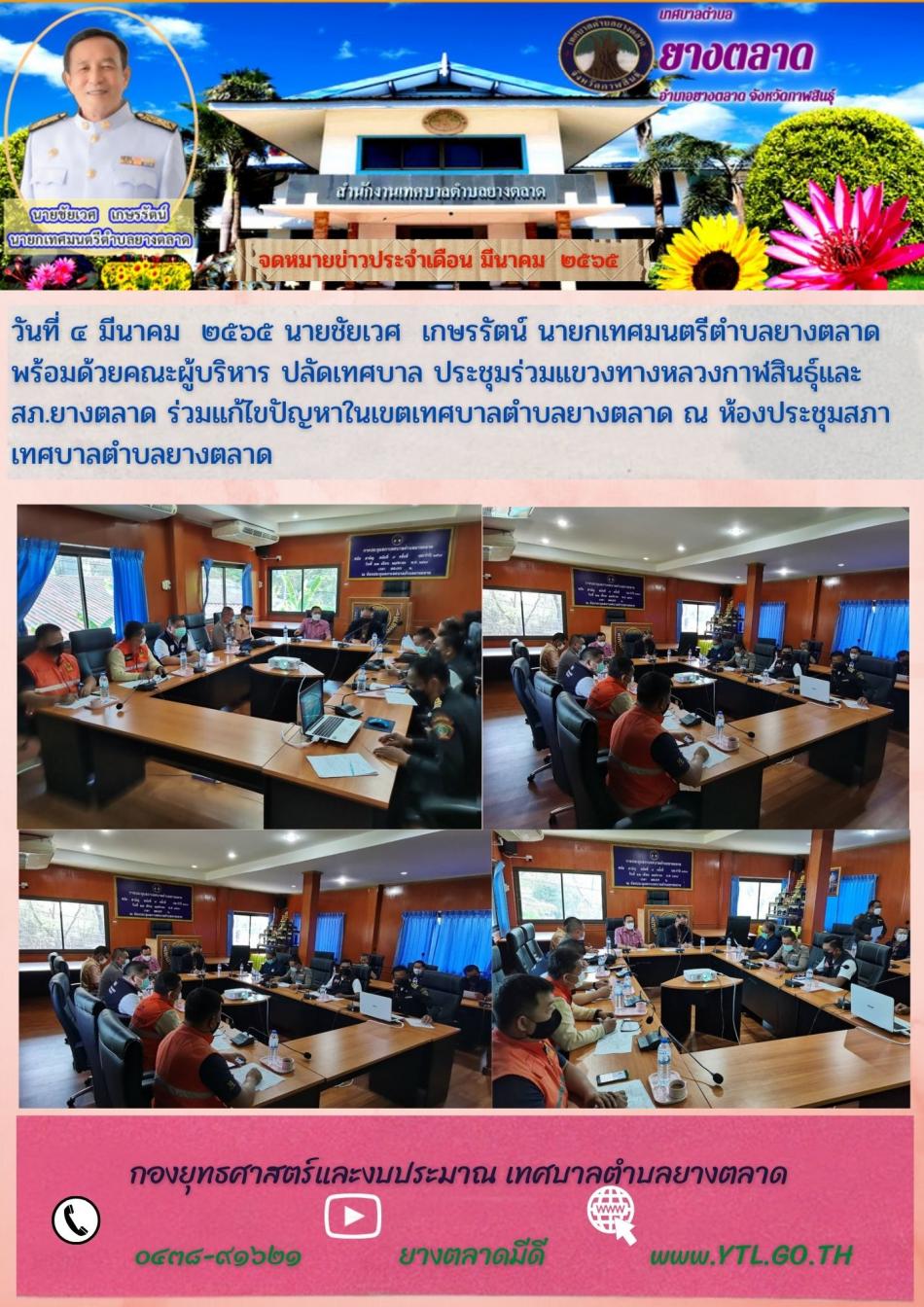 วันที่ 4 มีนาคม 2565 นายชัยเวศ เกษรรัตน์ นายกเทศมนตรีตำบลยางตลาดพร้อมด้วยคณะผู้บริหาร ปลัดเทศบาล ประชุมร่วมแขวงทางหลวงกาฬสินธุ์และสภ.ยางตลาด ร่วมแก้ไข้ปัญหาในเขตเทศบาลตำบลยางตลาด ณ... [4 มีนาคม 2565]