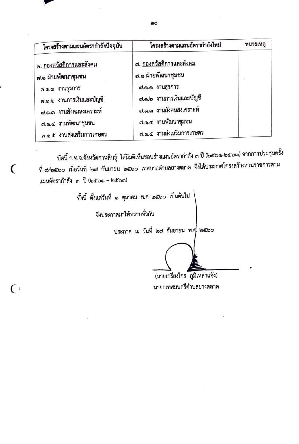 ประกาศเทศบาลตำบลยางตลาด เรื่อง โครงสร้างกำหนดส่วนราชการตามแผนอัตรากำลัง ๓ ปี (๒๕๖๑ - ๒๕๖๓)