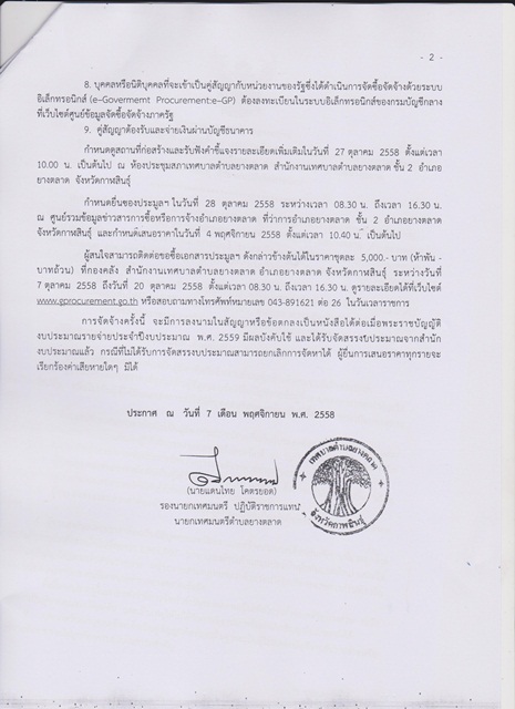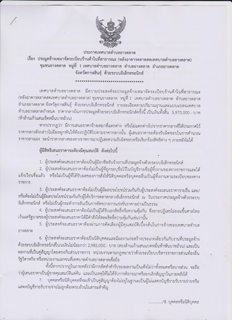 ประกาศเทศบาลตำบลยางตลาด เรื่อง ประมูลจ้างเหมาจัดระเบียบร้านค้าในที่สาธารณะ (หลังอาคารตลาดสดเทศบาลตำบลยางตลาด)