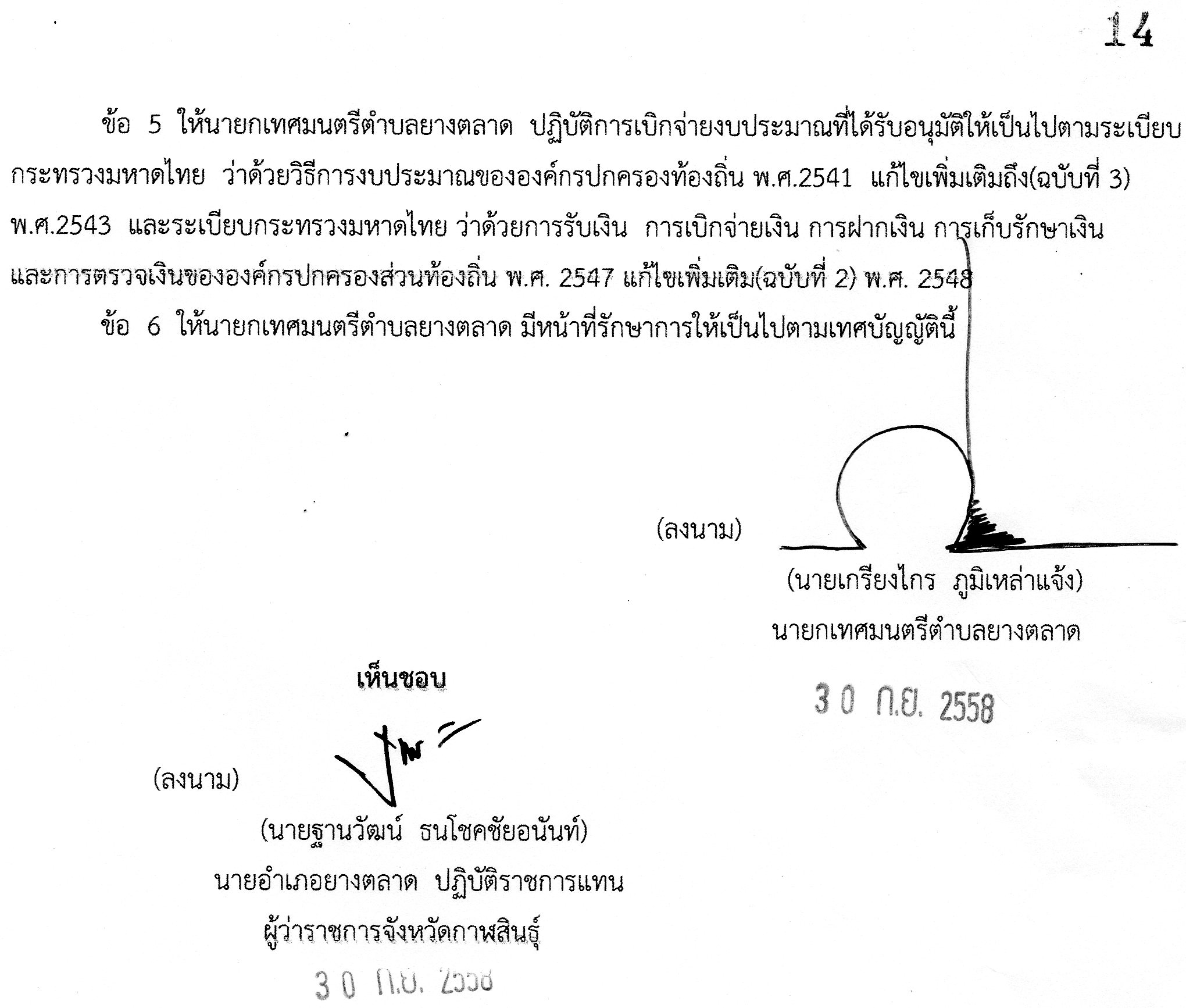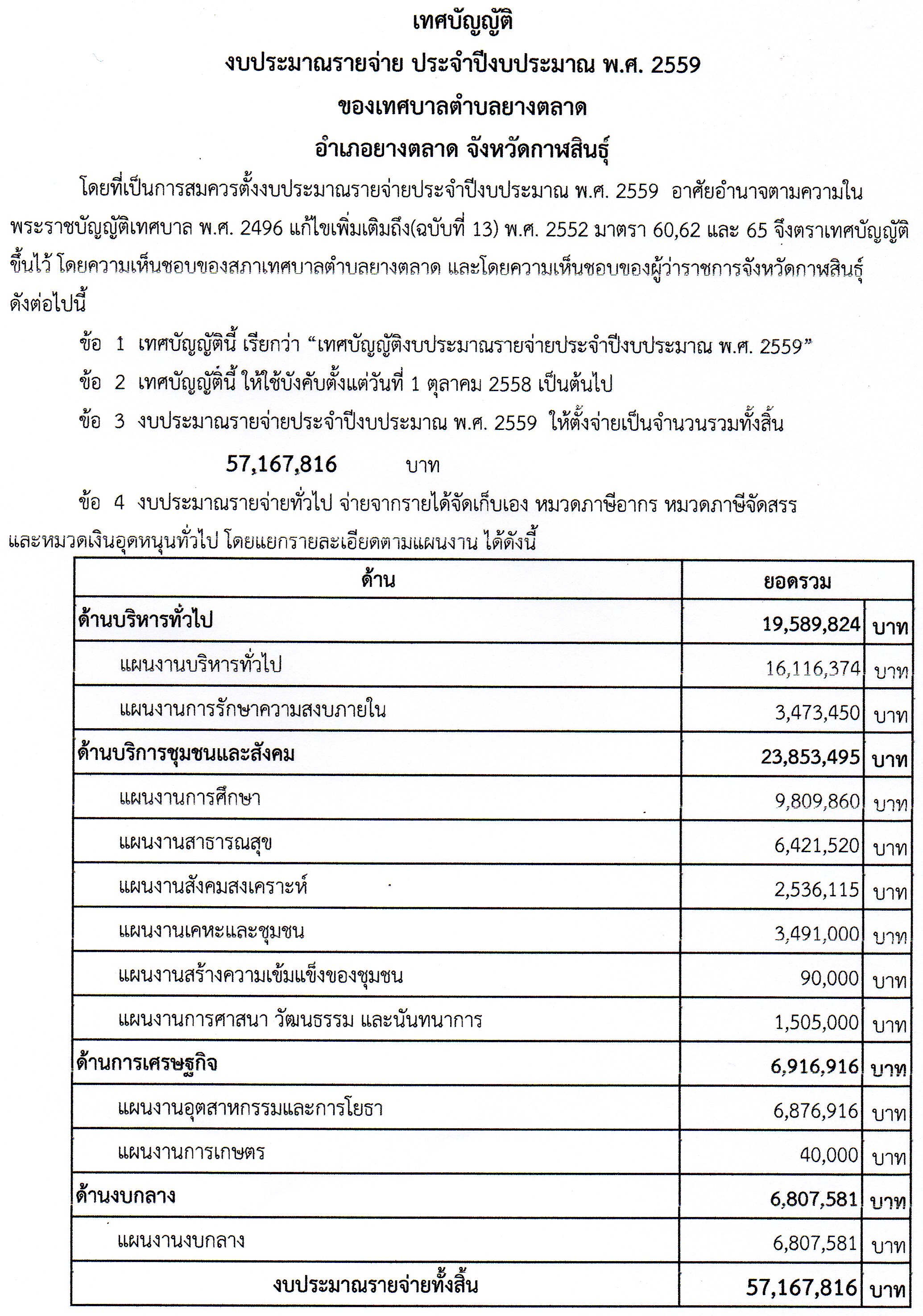 ประกาศใช้เทศบัญญัติงบประมาณรายจ่าย ประจำปีงบประมาณ พ.ศ.2559 เทศบาลตำบลยางตลาด